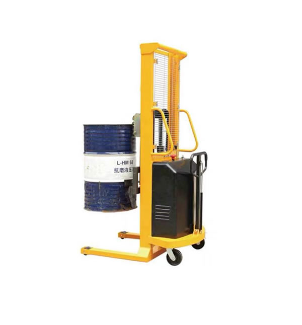 半電動油桶堆高車是一種手動推拉式,可電動升降。